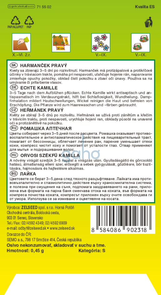 Pěstování: Heřmánek lze vysazovat od začátku jara až do léta v řádcích, semena do půdy jen jemně přitlačíme. Při výsevu na podzim přezimují i mladé rostliny, které vykvetou na jaře. Heřmánek oblibě sušší propustnou písčitou půdu a slunné stanoviště. Sbíráme polorozkvitnuté květiny a důkladně je sušíme. Návod na výsadbu a pěstování se nachází také na obalu produktu.