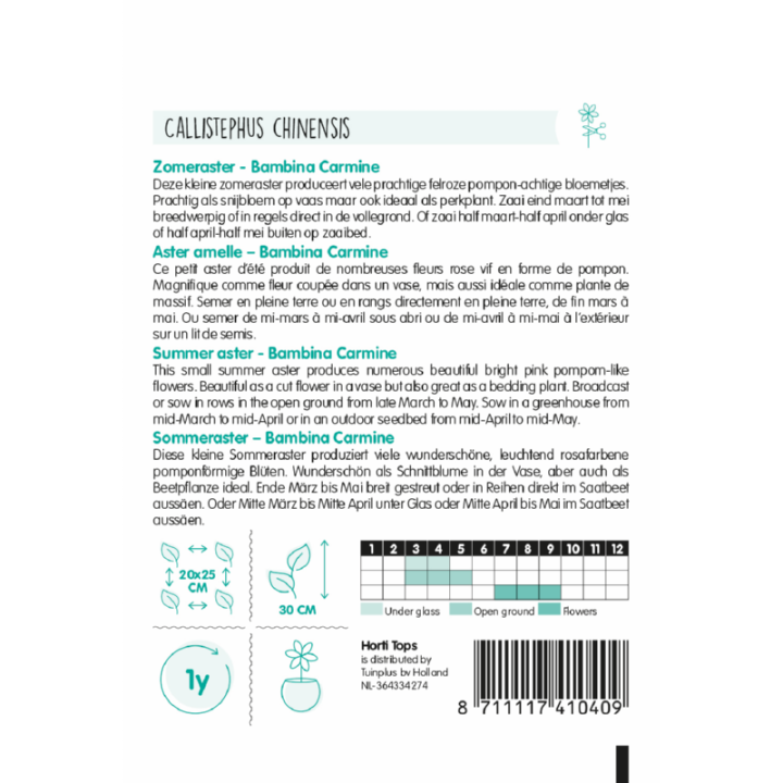 Pěstování: Semena astry vyséváme v termínu únor - březen ve skleníku, od dubna až do května do vnějších záhonů nebo do květináčů. Semena do půdy jemně zatlačíme a přihrneme zeminou. Odstraňujeme odkvetlé květy, abychom podpořili dlouhé kvetení. Astru vysazujeme každý rok na jiném stanovisku, vyžaduje dostatek slunce a hlinito-písčitou půdu s dostatkem živin. Nedoporučujeme přímé organické hnojení. V průběhu vegetace ošetřujeme proti mšicím. Obsah balení : cca 20 sem.