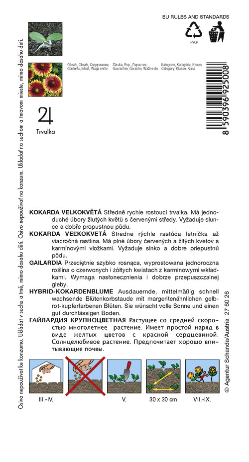 Charakteristika: Kokarda je rychle rostoucí trvalka dorůstající výšky 40-60 cm. Kvete od června Tato nádherná rostlina kvete od června velkými, žlutohnědými květy, které připomínají malá sluníčka. Každý květ se skládá z jasně žlutého středu a ohnivých okrajů, které se rozprostírají do sytých odstínů hnědočervené. Listy jsou široce kopinatého až vejčitého tvaru, syté zelené barvy. Rostlina je vhodná pro výsadbu do květináčů, trvalkových záhonů, skalek.