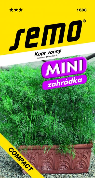 Charakteristika: Kopr vonný 'COMPACT' je kompaktní odrůda určená pro pěstování v květináčích či jiných nádobách. Rostlina je nízká, v plném růstu 30-40 cm vysoká, bohatě olistěná s tmavĚ zeleným listem. Vyniká jemnou kořeněnou chutí. Patří mezi kuchyňské bylinky, které by v zahradě rozhodně neměly chybět. Jeho listy v čerstvém nebo sušeném stavu se používají k ochucení rybích pokrmů, omáček či zavařování zeleniny. Mají také pozitivní účinky při nespavosti.