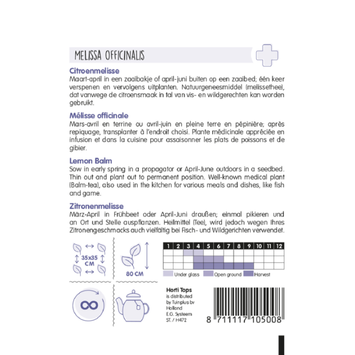 Pěstování: Semena meduňky vysazujeme brzy na jaře nebo pozdě na podzim. Semena vyséváme přibližně do 2 cm hloubky na chráněné slunné stanoviště. Klíčení osiva trvá přibližně 3-4 dny. Sbíráme listy během slunečného počasí. Návod na výsadbu a pěstování se nachází na obalu.