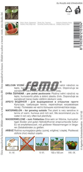 Pěstování: Semeno sázíme v dubnu až v květnu na sadbu, nebo v květnu do zahrad. Melouny vyžadují slunné, chráněné stanoviště. Pokud jde o půdu, melouny vysazujeme do neutrálních nebo mírně zásaditých půd. Půdu můžete přihnojit chlévskou mrvou. Rostliny se doporučuje nastlat černou netkanou textilií nebo slámou. Hmotnost balení : cca 0,6 g
