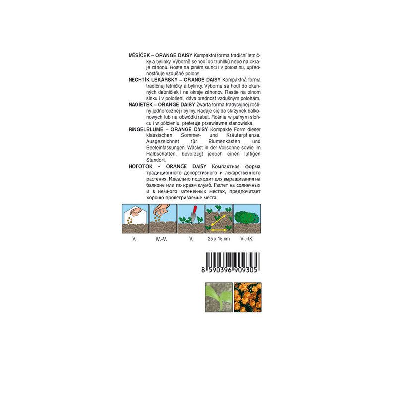Charakteristika: Měsíček ´Orange Daisy´ patří do kolekce MINI ZAHRÁDKA - přirozeně zakrslý růst. Je to nenáročná větvená letnička s kopími, aromatickými listy. Oranžové květy se používají do čajových směsí i pro přípravu měsíčkového masti. Rostlina dorůstá výšky 20 cm. Hmotnost balení: 0,6 g