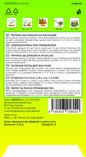 Pěstování: Papriku vyséváme do krytého prostoru (ve skleníku nebo ve fóliovníku) do humózní půdy v březnu až v dubnu. V květnu papriku přesazujeme do venkovního záhonu na slunné nebo polostinné stanovisko. Vyžaduje teplé propustné půdy s bohatou zásobou živin, pravidelné okopávání, závlahu a přihnojování. Vysazujeme po 2 rostlinách. Ideální teplota je kolem 20-24 ° C. Plody sklízíme v červenci až v září. Hmotnost balení: 0,7 g.