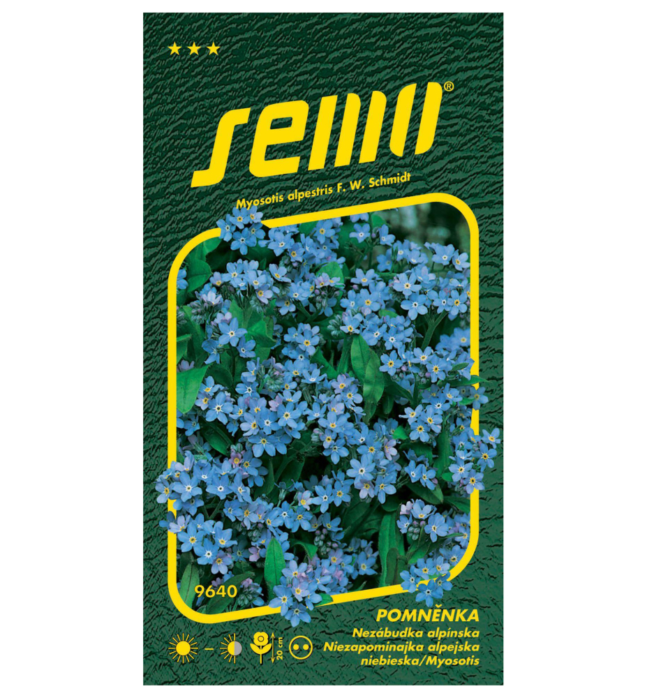 Balení semen alpínské pomněnky s malými modrými květy.