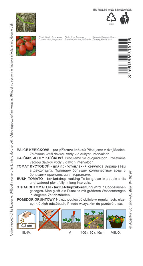 Pěstování: Semena rajčete jedlého vyséváme v březnu až v dubnu na teplé stanovisko v interiéru nebo ve skleníku či fóliovníku. Rajčata vyžadují půdu bohatou na živiny. Do vnějšího záhonu přesazujeme rostliny přibližně v polovině května až v červnu. Plody sbíráme v červenci až v září. Hmotnost balení : cca 1 g.