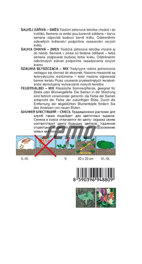 Charakteristika: Okrasná šalvěj je rychle rostoucí letnička pro skupinové záhonové výsadby vhodná i do okenních truhlíků. Kolekce'Paleta farieb' obsahuje směs odstínů bílé, lososové a levandulové barvy trubkovitých květů. Semena ve směsi jsou barevně rozlišeny, barva semen odpovídá barvě květů rostliny, která z nich vyroste.