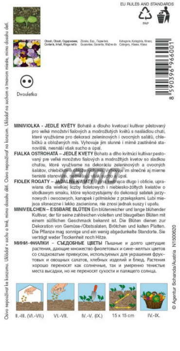 Charakteristika: Balení semen jedlých květů violky obsahuje fialové a modro žluté květy, které můžete využít k na ozdobu dortů, zákusků či dezert. Kromě výzdoby sladkých jídel je můžeme také použít i na ozvláštnění masa, salátů a sladkých nápojů. Jedlé květiny kromě estetických vlastností vynikají i nasládlou chutí a jsou jim připisovány afrodiziakální vlastnosti.