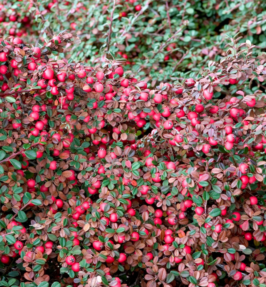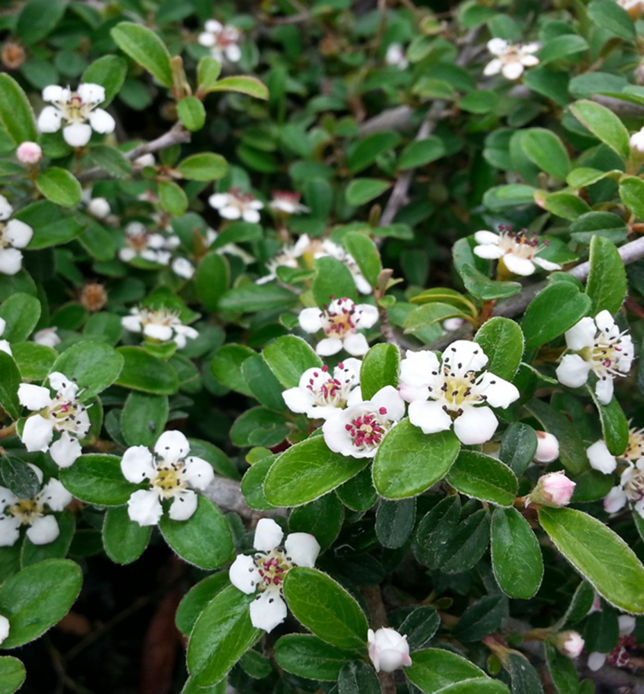 Nízký, půdokryvný skalník s množstvím bílých květů a výrazných červených plodů.