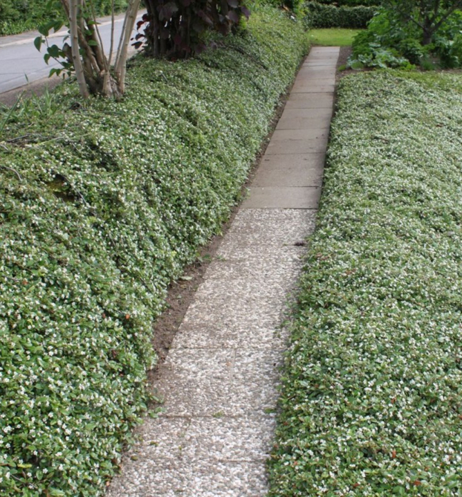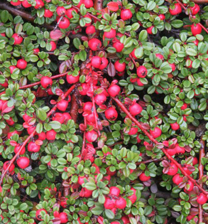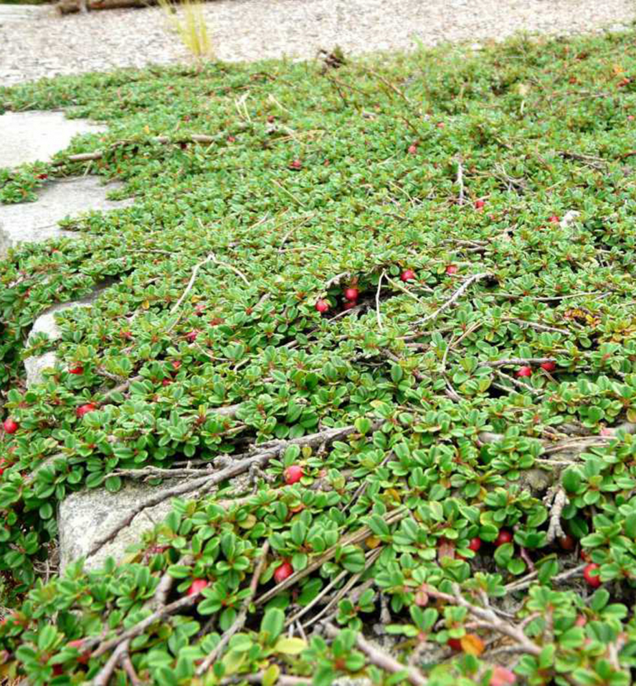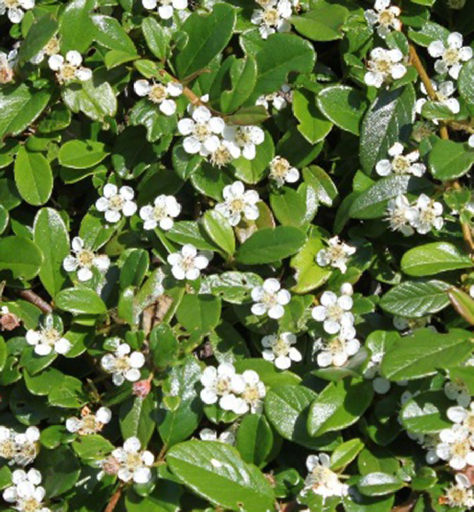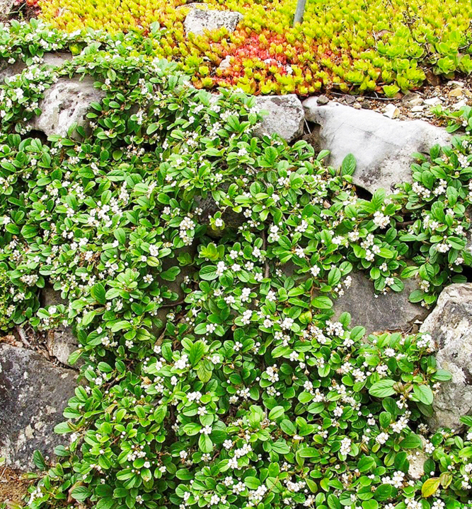 Stálezelený nízký skalník s lesklými listy vytvářející hustý koberec.