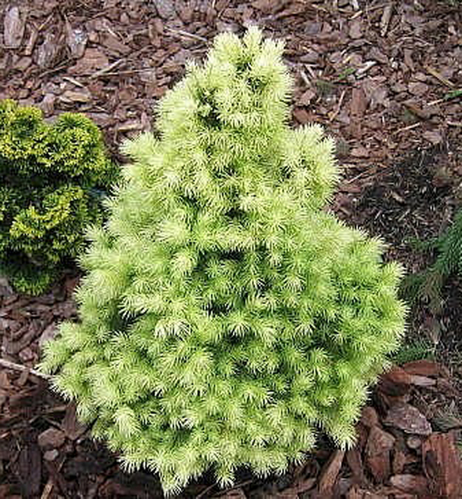 Trpasličí odrůda smrku bílého s nápaditým krémově bílým jehličím.