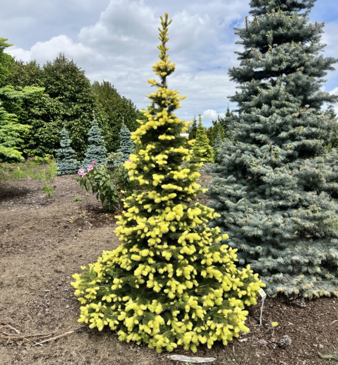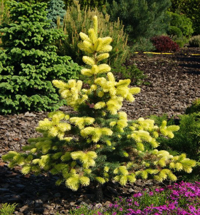 Nápadný smrk kuželovitého tvaru se zářivě žlutými mladými výhony.