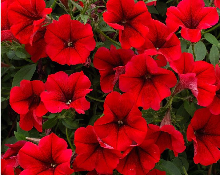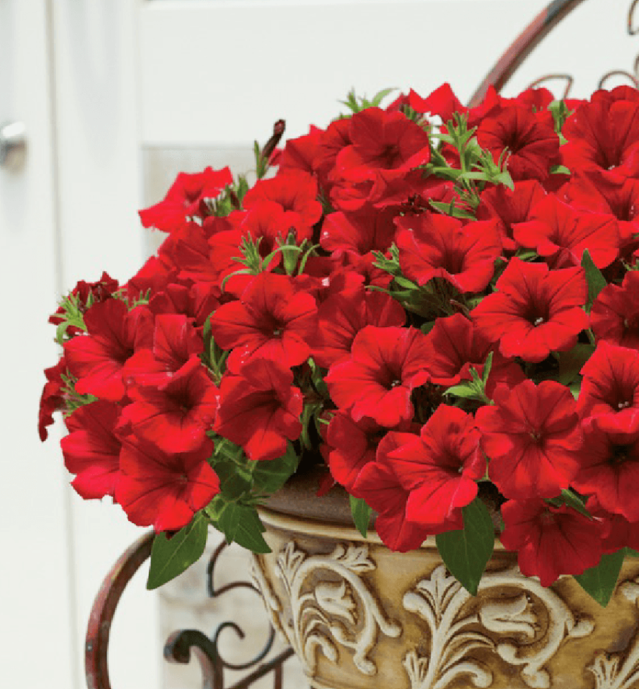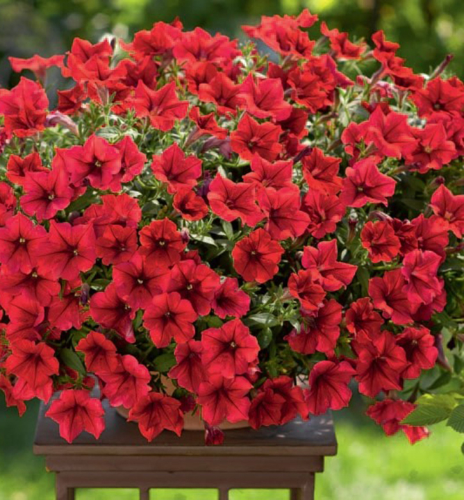 Nepřehlédnutelná převislá surfinie s intenzivně červenými květy.