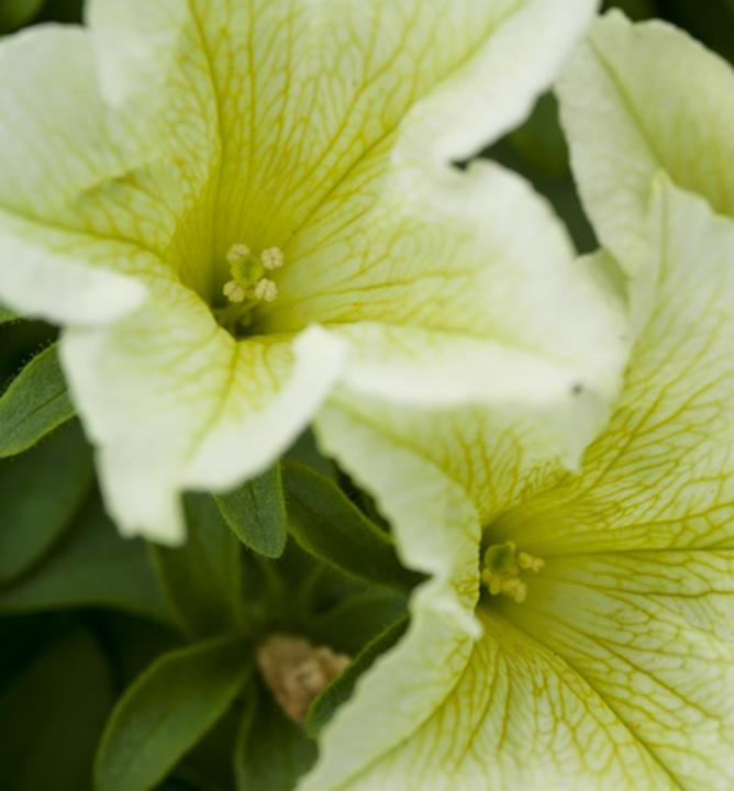 Žádaná limetková surfinie se světle žlutými květy s výrazným žilnatením.