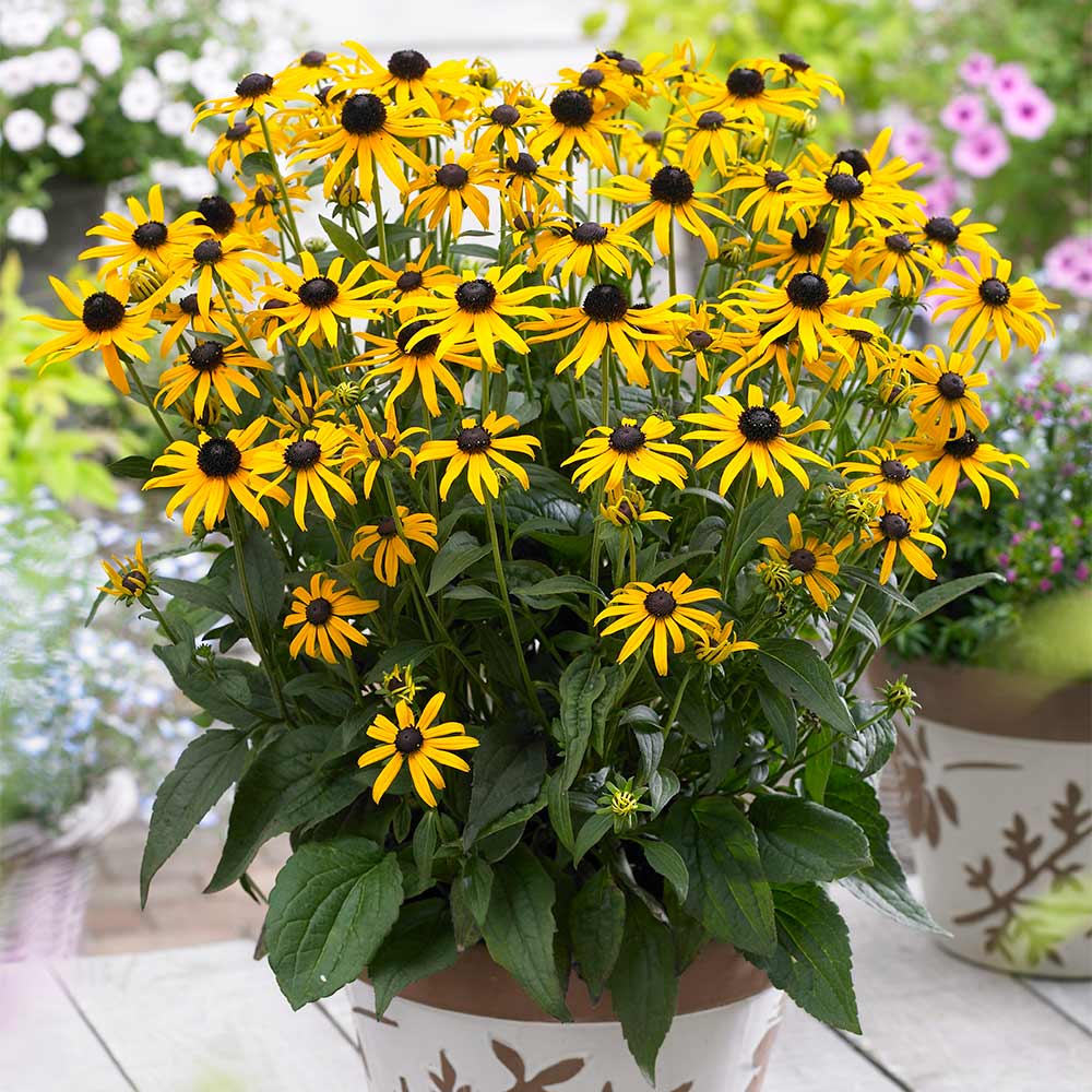 Kompaktní rudbekie se zářivě žlutými velkými květy, vhodná i k řezu.