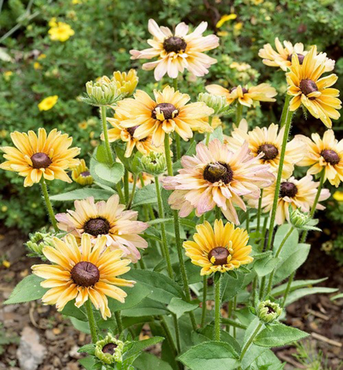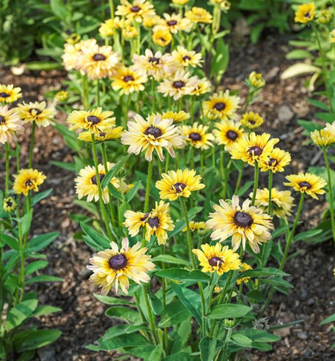 NOVINKA! Nízká rudbekie s poloplnými vanilkově-žlutými květinami.