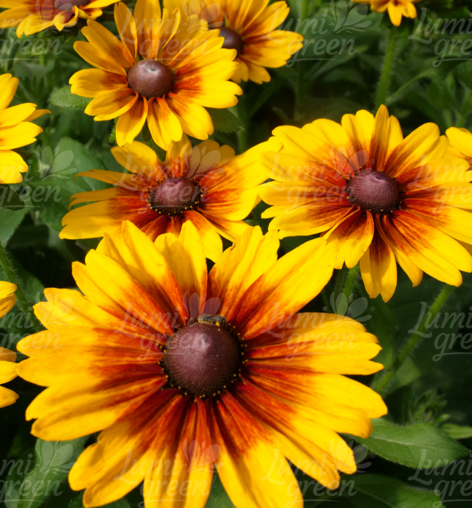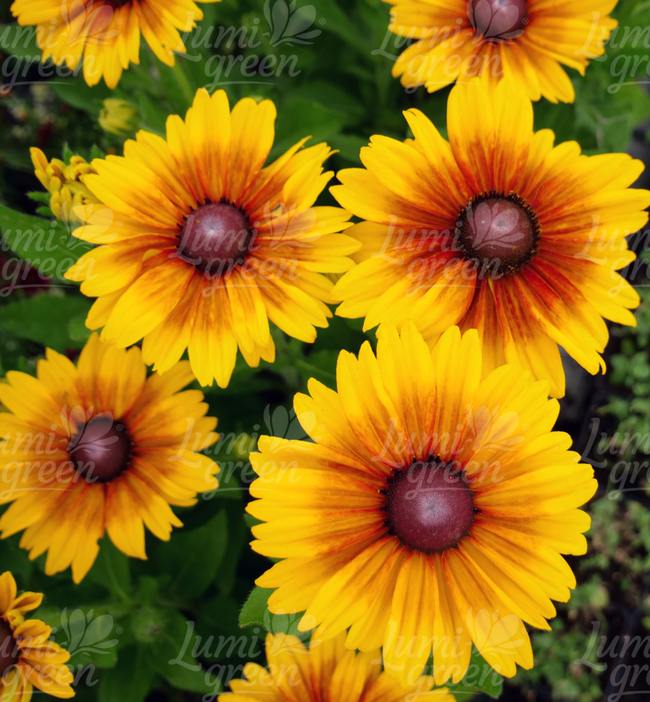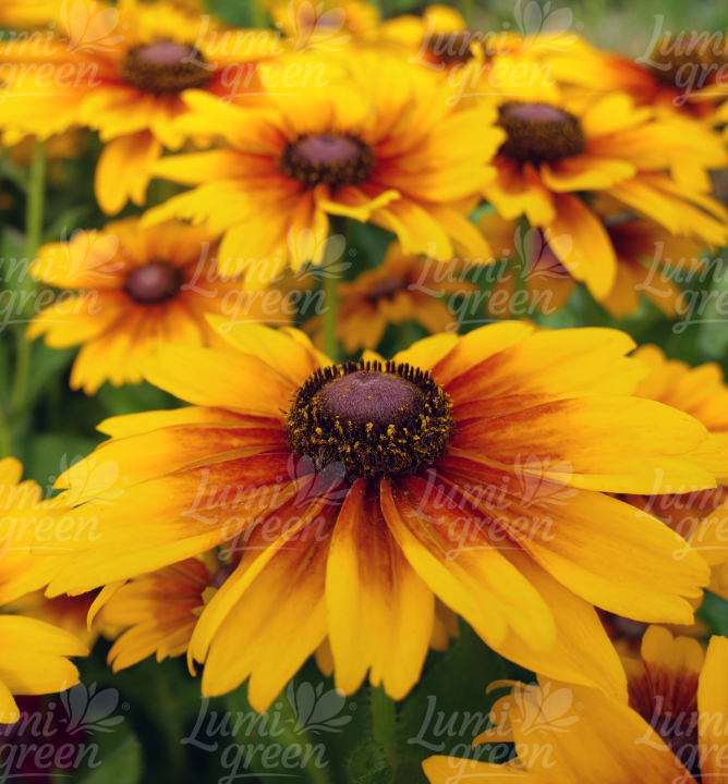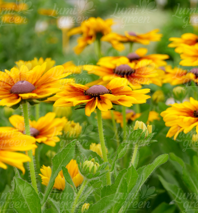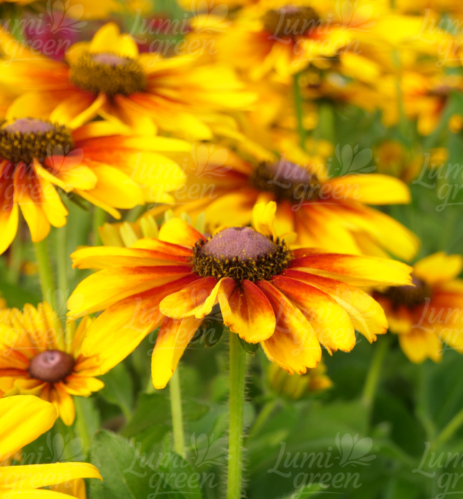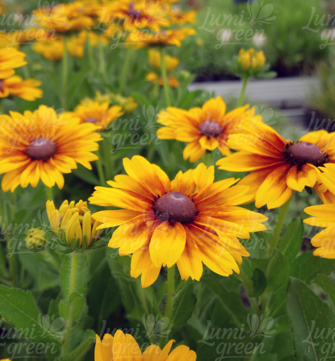 Středně vysoká rudbekie se spoustou dvoubarevných květin.