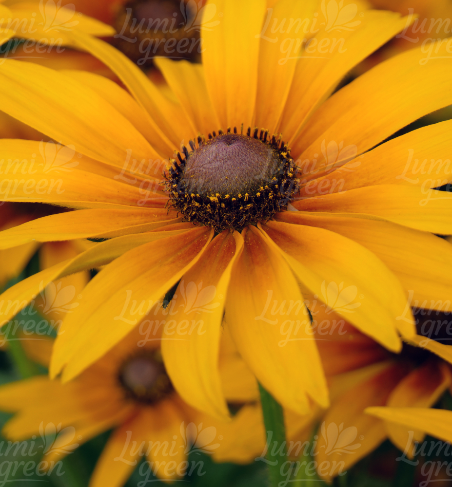 Oblíbená rudbékie s velkými oranžově žlutými květy a mahagonovou kresbou.
