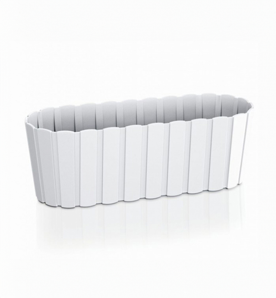 Bílý oválný plastový truhlík, který navozuje dojem, že je vyroben z malých desek.