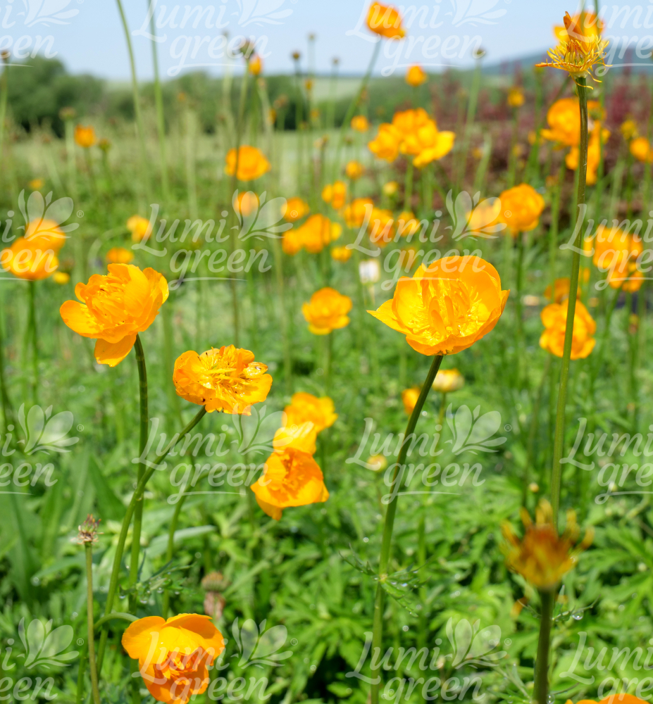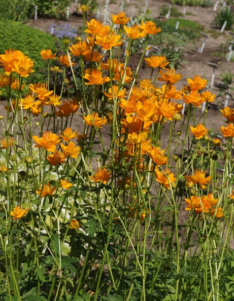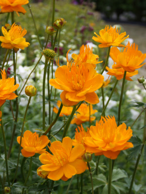 Neobvykle světlá odrůda upolínu se zářivými oranžovými květy.