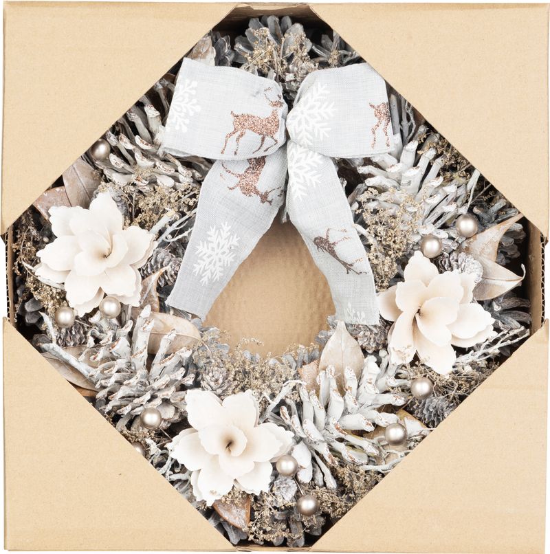Charakteristika: Tento věnec je vyroben z přírodních materiálů, jako jsou koblihy a sušené dekorace, které působí autenticky a přinášejí do interiéru kousek přírody. Dekor je doplněn ozdobnou mašlí se zimním motivem., která dodává věnci originální a tradiční vzhled. Věnec má praktické poutko na zavěšení, takže jej jednoduše umístíte na dveře, stěnu nebo okno. S průměrem 30 cm je ideální dekorací pro každý domov během adventního a vánočního období.