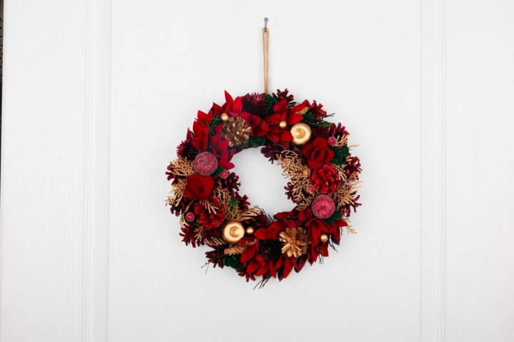 Elegantní vánoční věnec v červeno-zlaté barevné kombinaci.