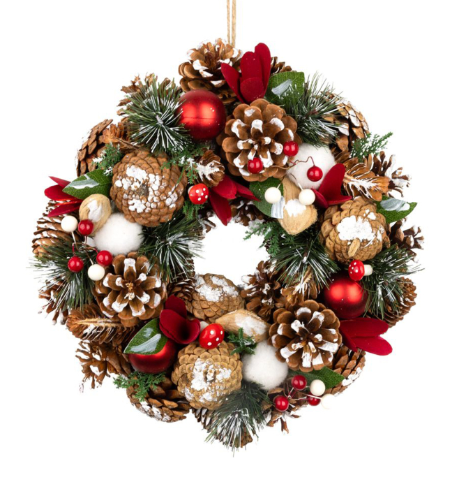Nádherný vánoční věnec zdobený přírodními a umělými dekoracemi.