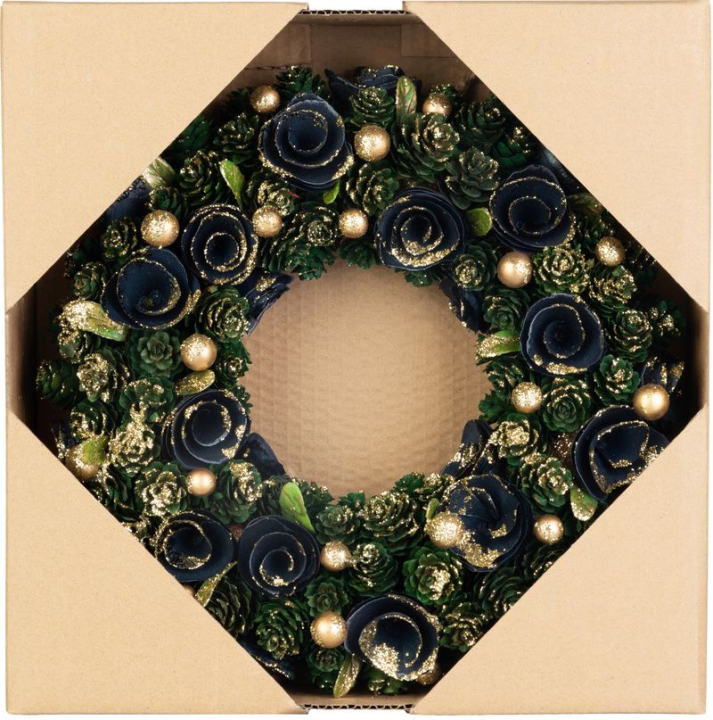 Charakteristika: Vánoční věnec MagicHome v zeleno-modro-zlaté barevné kombinaci je krásnou a stylovou dekorací, která vnese do vašeho domova pravou sváteční atmosféru. Věnec je zdoben přírodními koblihami, dekorativními květy a ozdobnými kuličkami v zeleno-modro-zlatých tónech, které vytvářejí moderní a přitom teplý vzhled. Díky praktickému závěsnému poutku jej můžete jednoduše umístit na dveře, stěnu či okno. Je ideálním doplňkem pro interiér, ale také kryté exteriérové ??prostory.