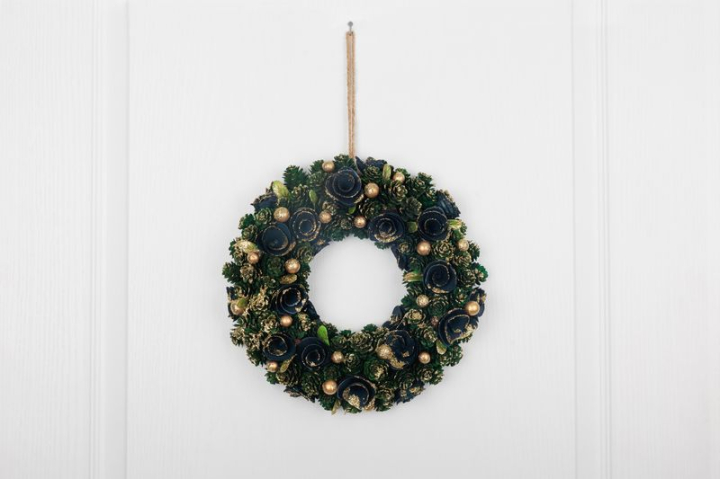 Elegantní vánoční věnec v zeleno-modro-zlaté barevné kombinaci.
