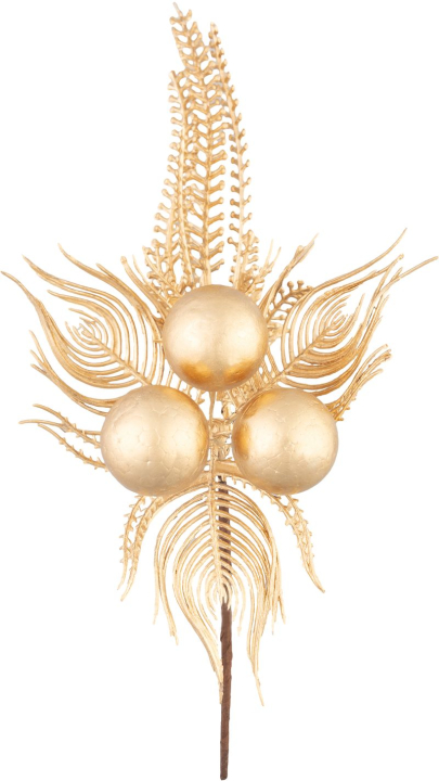 Charakteristika: Zlaté paví peříčka v kombinaci s dekorativními kuličkami působí luxusně a dokonale doplní tradiční i moderní aranžmá. Výška je 22 cm.