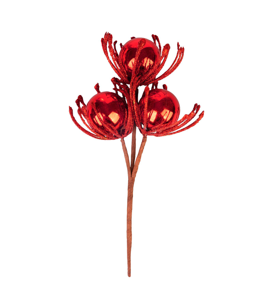 Charakteristika: Vánoční dekorace větvička v červeném provedení dotvoří čarokrásnou atmosféru Vánoc ve vašem domově. Tato dekorace je zdobena lesklými koulemi, které dodají vašim aranžmá jedinečný a zářivý vzhled. Větvička je ideálním doplňkem na vánoční stromek, do váz, věnců nebo stolních aranžmá. Díky výrazné červené barvě dokonale ladí s tradičními vánočními ozdobami. Výška je 22 cm.