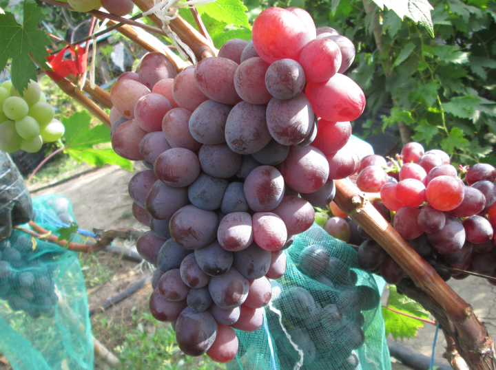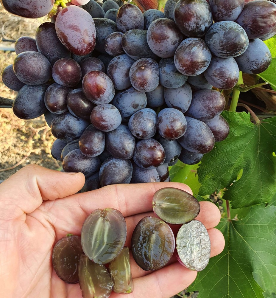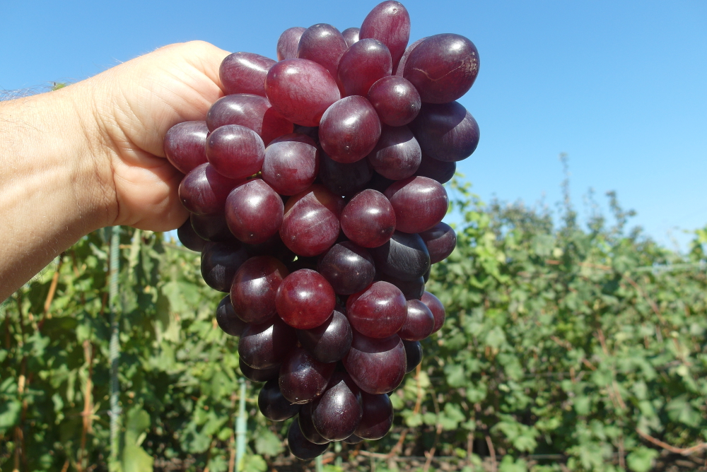 Raná odrůda réva, odolná vůči chorobám a mrazu, s bezsemennými sladkými bobulemi.