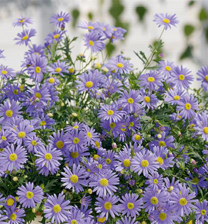 Bohatě kvetoucí letnička s jemnými světlo fialovými květy a žlutým středem.