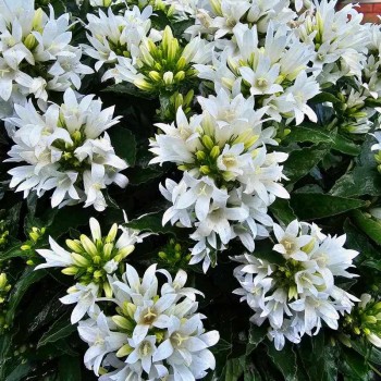 Charakteristika: Zvonek klubkatý ´GENTI WHITE´ roste mimořádně hustě a kompaktně. Dorůstá výšky 35-40 cm. Od začátku léta začíná tvořit máslové poupata, ze kterých se později vytvářejí nádherné sněhobílé zvonkové květy seskupené do půlkulovitých květenství. Právě ty dodávají letním záhonům něžnost a eleganci. Jsou vyhledávány včelami a jiným užitečným hmyzem. Velice pěkně vynikne na okrajích záhonů v kombinaci s modrým kultivarem. Je ideální pro výsadbu do venkovských a lučních zahrad.