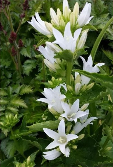 Stredne vysoký zvonček so snehobielymi polguľovitými súkvetiami.